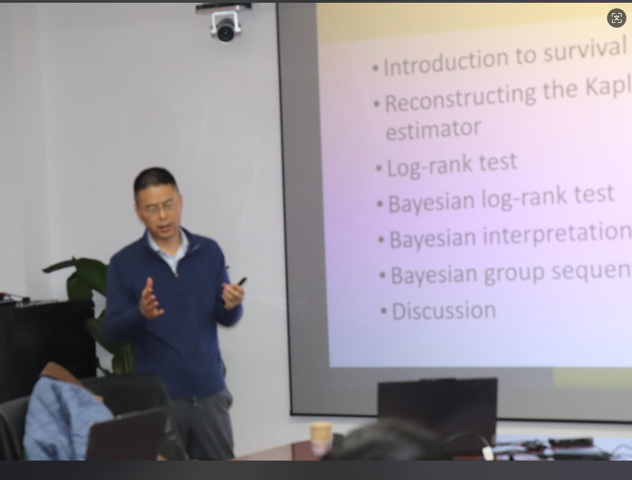 讲座内容学术性与实践性兼具。尹教授通过理论推导与实际案例相结合,为师生们展示了贝叶斯方法如何在长随访时间的临床试验数据中优化分析效率。他提出了一种新的方法,用于改进Kaplan-Meier估计量在长期生存数据中的应用,从而为临床试验设计提供了全新的思路。