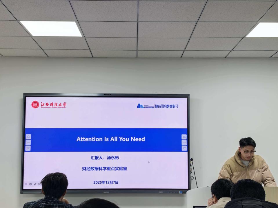当日下午,经济系统数字孪生常态化学术研讨会顺利召开。会议聚焦“夜间灯光数据识别收缩城市”、“中国经济韧性时空特征”、“Transformer神经网络架构”、“中国上市公司数字化水平测度”四大前沿主题,深入展示了江西财经大学财经数据科学重点实验室在非结构化数据挖掘、AI与财经交叉融合、宏观经济监测及城市发展研判等方面的最新进展。在夜间灯光数据识别收缩城市研究中,研究构建融合夜间灯光与社会经济数据的两阶段识别框架,识别出2000–2022年间77个收缩城市,主要分布于东北和长江中游地区,并将其划分为持续、偶发、暂时收缩三种类型,为城市差异化治理提供科学依据。在中国经济韧性研究中,针对传统方法在处理混频数据和时空维度分析上的不足,研究创新采用马尔科夫区制转移混频动态因子模型,整合多年多频数据,构建涵盖多类动能来源的评价体系。研究揭示了中国省际经济演进的三个阶段及显著的区域异质性,所构建的经济形势指数对危机响应更为灵敏,为宏观政策与高质量发展提供支撑。在Transformer神经网络架构研究中,研究系统剖析了传统RNN/CNN模型在并行计算与长距离依赖捕捉上的局限,阐释了Transformer通过自注意力机制与位置编码实现高效语义建模的核心优势,为AI在财经文本分析与风险预测中的应用奠定理论基础。在中国上市公司数字化水平测度研究中,针对现有术语词典覆盖面有限的问题,研究提出BERT-GlobalPointer系列模型,通过“算法+人工”混合标注构建大规模数字化词典。基于该词典的测度表明,近二十年我国上市公司数字化水平整体上升,2020年后呈现爆发增长,数字化技术成为转型关键驱动力。